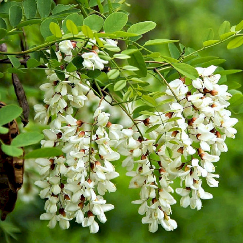 Акація біла має дуже потужну кореневу систему, коріння якої проникають на глибину до 20 і більше метрів. Листя непарноперисті, на коротких черешках, які у напрямку до гілки видозмінюються в хрящевидний неправдиві піхви. Лист становить від 4 до 8 пар еліптичних, світло-зелених, м'яких, цілокраї листочків.