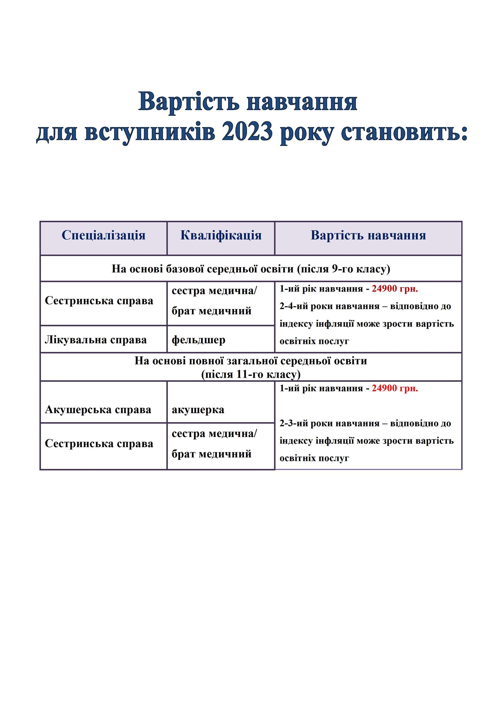 Ступінь освіти – фаховий молодший бакалавр: на основі БЗСО (9-ти класів) – 3 роки на основі ПЗСО (11-ти класів) – 2 роки (денна форма навчання), 2,5 роки (заочна форма навчання)