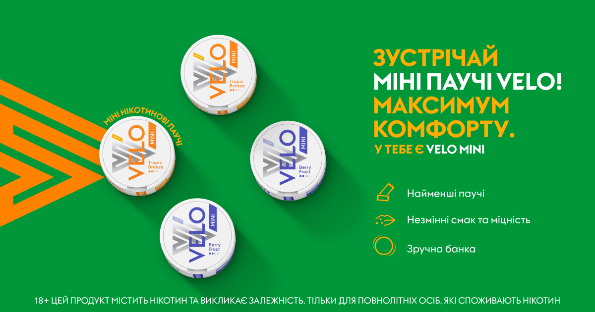 VELO – продукт родом зі Швеції високої якості. Унікальна запатентована формула забезпечує рівномірне виділення нікотину протягом всього періоду використання. VELO не залишає слідів на зубній емалі. VELO можна використовувати без обмежень будь-де і будь-коли (кафе, бари, кінотеатри, транспорт).